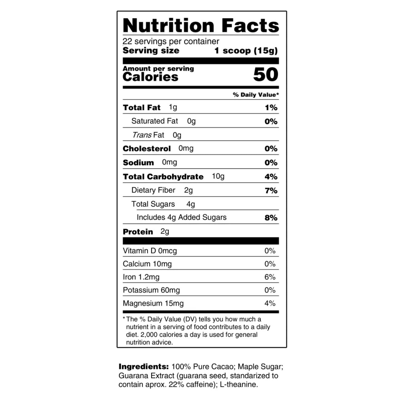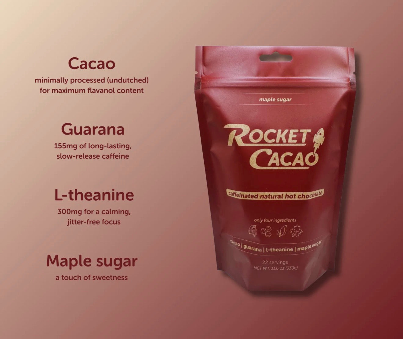 Rocket Cacao Maple Sugar is a functional hot chocolate made with minimally processed cacao, natural caffeine from guarana, calming L-theanine, and pure maple sugar. It delivers smooth, long-lasting energy with focused mental clarity—without the crash.
