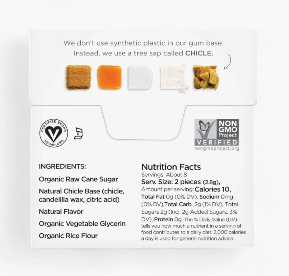 Organic Raw Cane Sugar, Natural Chicle Base (chicle, candelilla wax, citric acid), Natural Flavor, Organic Vegetable Glycerin, Organic Rice Flour